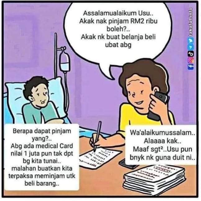 Susah sebenarnya untuk mengharap bantuan orang lain takut kita kecewa dan tinggal harapan saja. Adik beradik dan saudara mara, mereka semua mempunyai komitmen mereka sendiri. Kerana simpati mereka keluarkan bantuan tetapi akhirnya pasangan kita juga yang akan menanggungnya.Sediakan medical card segera bukan untuk orang lain, untuk kemudahan diri sendiri.